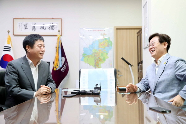 정찬민 경기 용인시장(왼쪽)은 지난 22일 성남시청 시장 집무실에 열린 ‘무상교복 등 문화·복지정책 간담회’에 참석해 이재명 성남시장과 환담을 나눴다. 사진은 정 시장과 이 시장이 의견을 나누고 있는 모습.(사진제공=용인시청)
