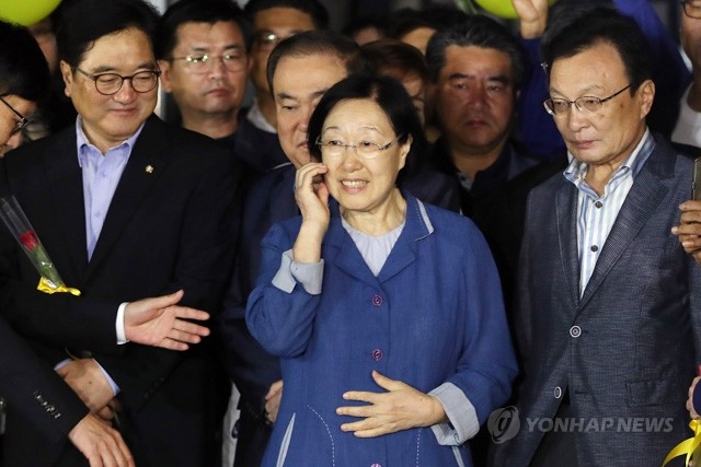 한명숙 전 국무총리가 23일 새벽 경기도 의정부시 고산동 의정부교도소에서 만기 출소하며 소감을 밝히기 위해 취재진 앞으로 이동하고 있다.