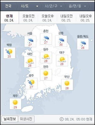 내일 아침부터 서울과 경기도, 강원영서에 오후 사이에 시간당 50mm 이상의 강한 비가 내리며 호우특보가 발표될 가능성이 높으며 기상청은 25일 금요일 오전에 서울을 포함한 중부 지방에 맑은 날씨를 보이겠으며, 남부지방에는 1~4mm의 비가 내리다가 오후에 전국 대부분 지역에서 비가 그칠 것으로 전망했다.