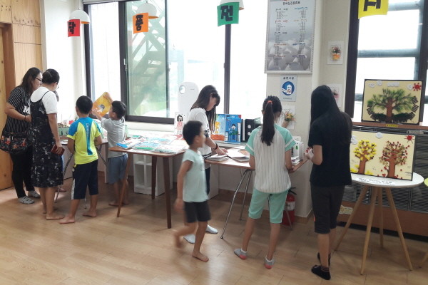 지난 23일 경기 이천시 백사면 검바위 공원에 위치한 백사작은도서관은 여름방학 체험 프로그램의 결과물로 작은 전시회를 개최했다. 사진은 어린이들이 전시물을 감상하는 모습.(사진제공=이천시청)