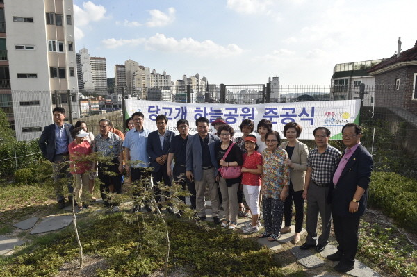서울 노원구는 지난 22일 ‘생활권 공원녹지 조성사업’의 일환으로 당고개역 상부에 조성한 ‘당고개 하늘공원’의 준공식을 개최했다. 사진은 김성환 구청장을 비롯한 지역주민 등 관계자들이 준공식에 참석해 기념촬영을 하는 모습.(사진제공=노원구청)