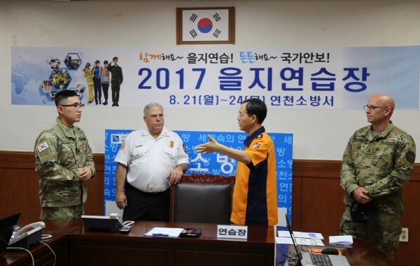 미2사단 미상안전재난처장이 지난 21일 을지연습 훈련 상황을 참관하고, 재난발생시 현장대응 활동 등에 대해 논의하고자 경기 연천소방서를 방문했다. 사진은 조경현 서장(왼쪽 두번째)이 미2사단 비상안전재난처장(왼쪽 세번째)과 이야기를 나누는 모습.(사진제공=연천소방서)