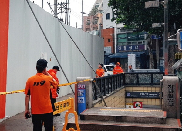 영등포소방서는 지난 24일 오전 8시경 영등포구시장역 4번 출구 재개발공사장 앞 3m 높이 펜스가 인도 쪽으로 기울어졌다는 시민들의 불편신고를 접수하고 현장에 긴급 출동했다. 사진은 소방관들이 기울어진 펜스에 안전조치를 하는 모습.(사진제공=영등포소방서)