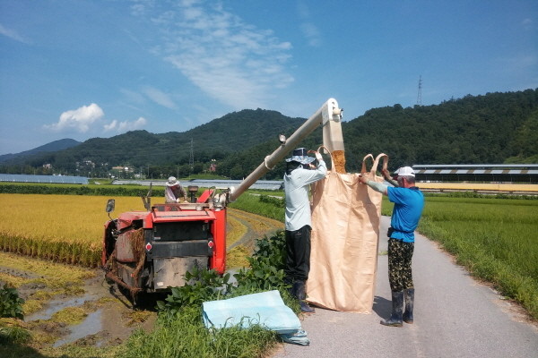 경기 양평군은 지난 25일 지평면 곡수리에 위치한 전경복씨의 논에서 ‘대풍기원 첫 벼베기 행사’를 실시했다. 사진은 전씨 등의 관계자들이 논에서 벼베기를 진행한 후 수확한 알곡을 자루에 옮겨 담고 있는 모습.(사진제공=양평군청)