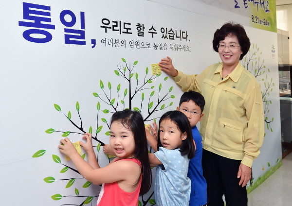 최근 서울 송파구가 을지훈련 기간 동안 구청내 종합상황보고실에 북한에 전하고 싶은 통일 관련 메시지를 작성해 붙일 수 있는 ‘통일염원 나무’를 설치·운영했다. 사진은 박춘희 구청장이 아이들과 함께 통일메시지가 적힌 종이를 붙이고 있는 모습.(사진제공=송파구청)