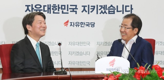 자유한국당 홍준표 대표가 29일 오전 서울 여의도 당사에서 예방한 국민의당 안철수 대표(왼쪽)와 환담하고 있다.