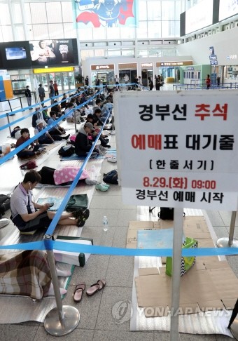 추석 열차승차권 예매일인 29일 오전 서울역 대합실에서 시민들이 표를 구매하기 위해 기다리고 있다. 코레일은 홈페이지(www.letskorail.com)와 역 창구를 통해 29일 경부·경전·동해·충북선 등을, 30일에는 호남·전라·장항·중앙선 등의 승차권을 판매한다.