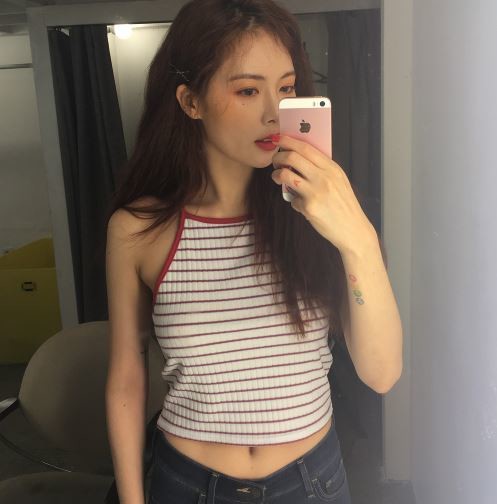 공개된 사진 속 현아는 거울을 통해 사진을 촬영하고 있다. 특히 크롭티를 착용한 현아의 무결점 몸매가 시선을 사로잡았다.
