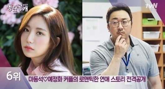 두 사람은 무려 17살의 나이 차이를 극복하고 자연스럽게 연인으로 발전했으며, 달달한 연애를 이어오고 있다. 마동석은 예정화를 “애기야”라고 부르는 것으로 알려졌다. 특히 예정화의 남동생은 벌써부터 마동석을 “매형”이라고 부른다는 후문이다.