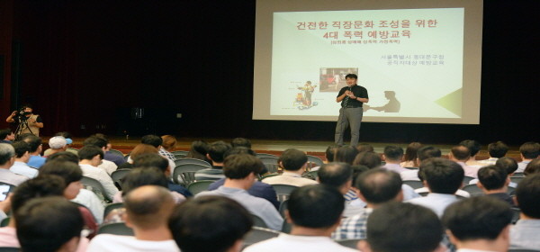 동대문구는 지난 30일 구청 다목적 강당에서 전직원을 대상으로 ‘2017 4대 통합(성희롱ㆍ성폭력ㆍ성매매ㆍ가정폭력) 예방교육’을 실시했다. 사진은 한국범죄학연구소 선임연구위원인 엄건령 강사가 강의하는 모습.(사진제공=동대문구청)