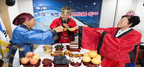 최근 은평구 산골마을에서 한 마을이였던 응암 녹번 마을을 하나로 만들기 위해 기획된 '은(恩)오(烏)교(橋)' 축제가 개최됐다. 사진은 전통혼례 식으로 진행되고 있는 마을 잔치에서 주례를 맡은 김우영 구청장이 신랑 신부와 술잔을 나누고 있는 모습.(사진제공=은평구청)