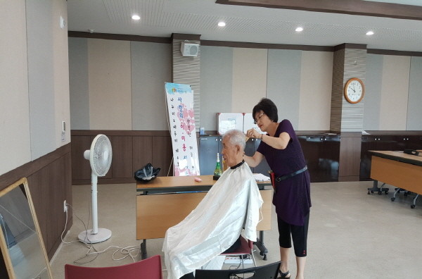 경기 수원시 팔달구 화서2동은 지난 29일 ‘나누미&베푸미’ 제4호점인 ‘예쁜머리샵’ 미용실에서 무료 이·미용 서비스를 실시했다. 사진은 미용실 관계자가 노인의 머리를 손질하는 모습.(사진제공=팔달구청)