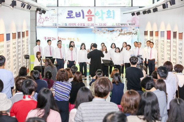 인천 계양구는 지난 30일 구청 1층 로비에서 ‘문화가 있는 날 로비음악회’를 개최했다. 사진은 지난 4월 창단한 구 공무원 합창단이 구민 앞에서 다양한 합창곡을 부르는 모습.(사진제공=계양구청)