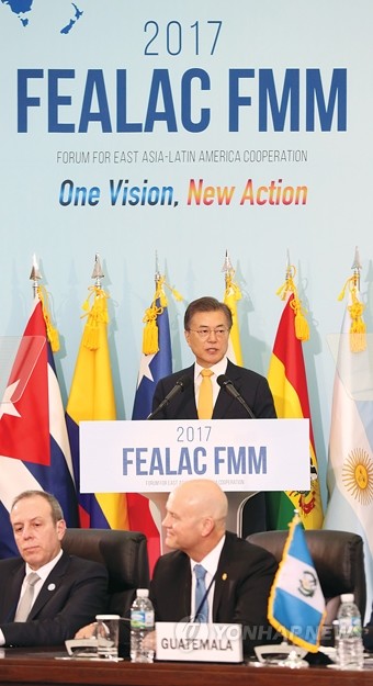 문재인 대통령이 31일 오전 부산 APEC 누리마루에서 열린 ‘제8차 동아시아-라틴아메리카 협력포럼(FEALAC)’ 외교장관회의 개회식에서 참석해 축사하고 있다. FEALAC은 한·중·일을 비롯한 아세안 10개국 등 동아시아 16개국, 아르헨티나·브라질·칠레·멕시코 등 중남미 20개국이 참석하는 정부 간 다자협의체다.