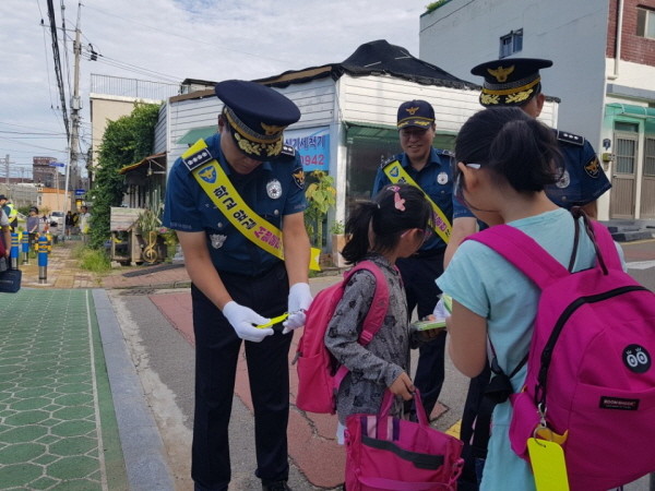 인천중부경찰서는 최근 개학기를 맞아 어린이들의 안전한 통학로 조성을 위해 인천 동구 창영초등학교 어린이보호구역에서 '등굣길 어린이 교통안전 캠페인'을 실시했다. 사진은 경찰관이 학생들의 가방에 '옐로카드'를 부착하는 모습.(사진제공=중부경찰서)