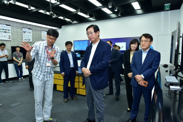 | ▲ 조환익 사장이 SKT네트웍 연구원 AR/VR 전시관을 방문해 관계자에게 설명을 듣고 있다. | ||