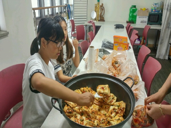 서울 성동구 성수2가제3동은 오는 11월까지 매월 둘째·넷째주 수요일 동주민센터에서 지역내 저소득 취약계층 홀몸노인을 위한 반찬 만들기 봉사활동을 진행한다. 사진은 최근 봉사활동에 참여한 지역내 초등학생들이 반찬을 만들고 있는 모습.(사진제공=성동구청)