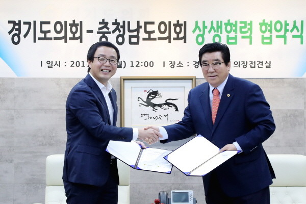 이날 정기열 경기도의장(더불어민주당, 안양4)은 의장 접견실에서 윤석우 충남도의장(자유한국당, 공주1)과 만나 이같은 내용의 업무협약을 체결했다.