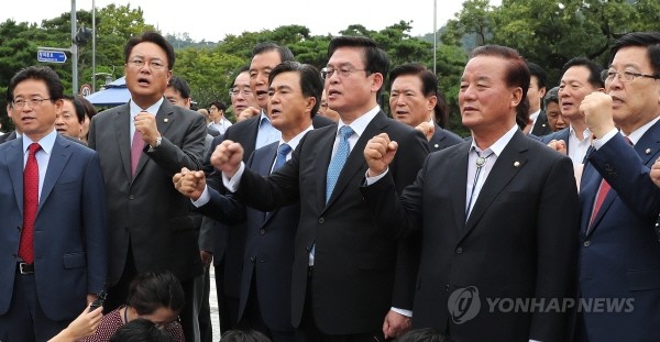 김장겸 MBC 사장 체포 영장 발부에 반발해 정기국회 보이콧을 선언한 자유한국당 정우택 원내대표 등 의원들이 5일 오후 청와대 앞 분수대 광장에서 기자회견을 열고 청와대 항의 방문 결과를 설명하며 구호를 외치고 있다.