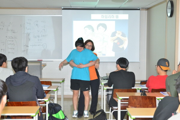 서울 영등포소방서는 지난 5일 영등포구 당산로 소재 한국과학기술 직업전문학교 학생을 상대로 '소방안전교육'을 실시했다. 사진은 소방관이 기도가 폐쇄됐을 때 응급처치하는 방법인 하임리히법에 대해 설명하는 모습.(사진제공=영등포소방서)
