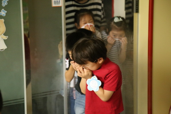 서울 강남소방서는 지난 5일 오전 소방서 2층 소방안전체험교실에서 논현동 소재 성결유치원 어린이 20여명을 대상으로 소방안전체험교육을 실시했다. 사진은 어린이들이 연기 대피훈련을 하는 모습.(강남소방서)