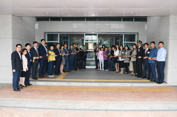 경기 오산시는 지난 5일 시청 현관에서 곽상욱 시장을 비롯한 시청 직원, 지역주민 등이 참석한 가운데 '오산백년시민대학 현판식'을 개최했다. 사진은 곽 시장을 비롯한 관계자들이 현판 제막에 앞서 기념촬영을 하는 모습.(사진제공=오산시청)