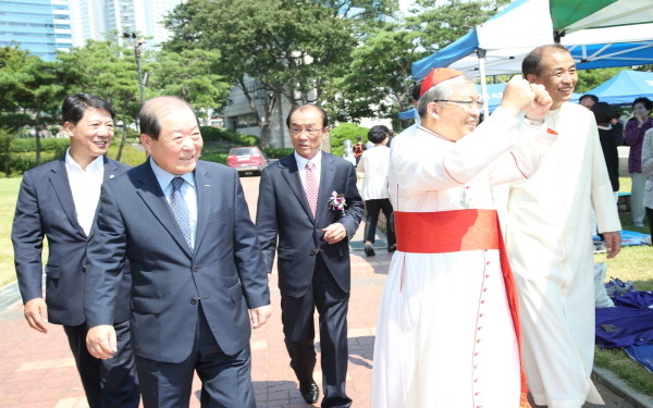박홍섭 마포구청장이 지난 3일 절두산 성지에서 열린 '서교동 성당 50주년 기념미사'에 참석했다. 사진은 박 구청장(왼쪽에서 두번째)이 염수정 추기경(오른쪽에서 두번째), 이봉수 마포구의원(왼쪽에서 첫번째) 등과 함께 미사에 참석한 시민들과 인사하는 모습.(사진제공=마포구청)