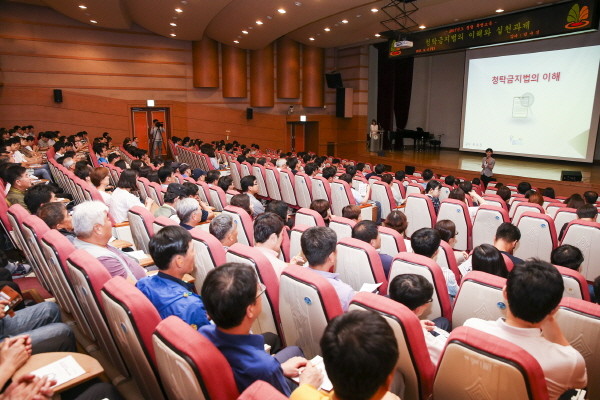 인천 계양구는 지난 4~5일 구청 대강당에서 전직원을 대상으로 청렴교육을 실시했다. 사진은 민수진 강사가 ‘청탁금지법의 이해와 실천과제’라는 주제로 강의를 진행하는 모습.(사진제공=계양구청)