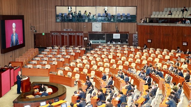 국민의당 김동철 원내대표가 6일 오전 국회 본회의장에서 교섭단체 대표 연설을 하고 있다. 자유한국당의 정기국회 보이콧은 이날도 계속돼 본회의에 참석하지 않았다.