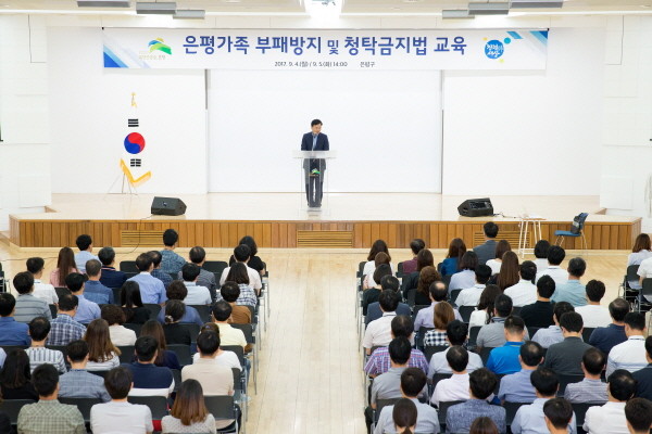 지난 5일 서울 은평구가 구청 본관 5층 은평홀에서 직원 700여명을 대상으로 '부패방지 및 청탁금지법 직원 교육'을 열고, 청렴의식 향상과 부패 는 깨끗한 공직문화 조성에 나섰다. 사진은 교육 진행 모습.