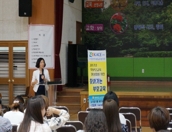 경북 구미시 문장초등학교는 지난 6일 학부모를 대상으로 '2017학년도 2학기 문장 4맥 교육과정' 설명회를 실시했다. 사진은 교사가 '2017년 주요 교육 활동 안내'를 진행하는 모습.(사진제공=문장초등학교)