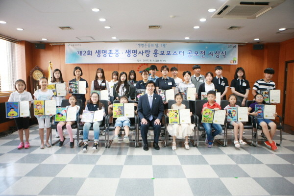 서울 강동구가 최근 지역내 초·중·고교생을 대상으로 생명사랑을 주제로 실시한 포스터 공모전 시상식을 개최했다. 사진은 이해식 구청장(앞줄 가운데)이 시상자들과 함께 기념촬영을 하는 모습.(사진제공=강동구청)