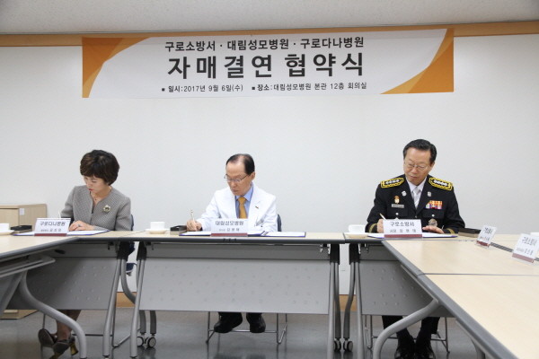 구로소방서는 지난 6일 오후 3시 대림성모병원 12층 회의실에서 대림성모병원 및 구로다나병원과 업무협약(MOU)을 체결했다. 사진은 관계자들이 협약서에 서명을 하는 모습.