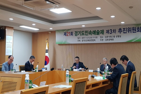경기 김포시가 오는 22~23일 김포시종합운동장에서 열릴 '제21회 경기도민속예술제'를 대비해 지난 6일 제3차 추진위원회를 개최했다. 사진은 관계자들이 심사위원 및 참가자를 확정하고 애로사항 해결을 위한 논의를 하는 모습.