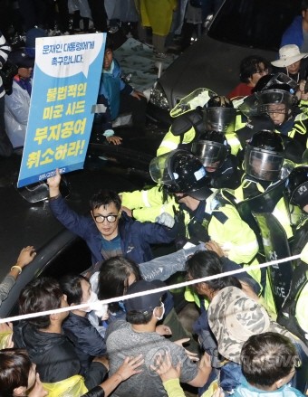 사드(THAAD·고고도미사일방어체계) 발사대 4기 추가배치가 예정된 7일 오전 경북 성주군 초전면 소성리 마을회관 앞에서 경찰이 사드배치 반대 집회 참가자들을 해산시키고 있다.