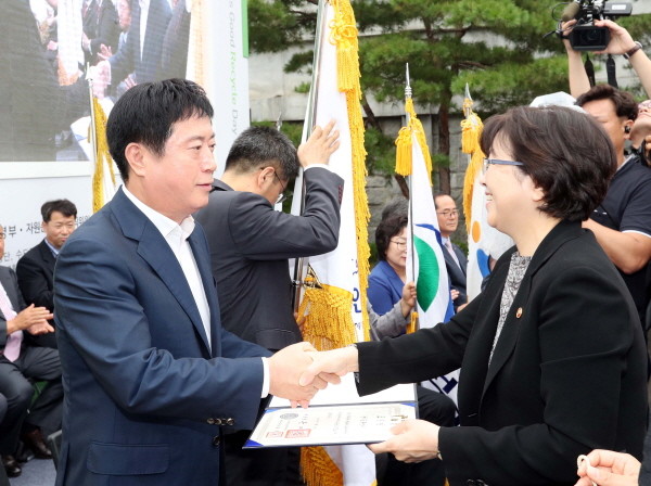 경기 용인시는 지난 6일 서울 종로구 국립민속박물관에서 열린 '제9회 자원순환의 날' 행사에서 환경부로부터 대통령상을 수상했다. 사진은 정찬민 용인시장이 김은경 환경부장관에게 '생활 및 음식물류 폐기물 관리 지자체 성과평가' 부문 대통령상을 받고 있는 모습.(사진제공=용인시청)