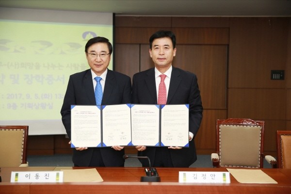 서울 도봉구가 최근 (사)희망을 나누는 사람들과 ‘지역내 저소득 취약계층 아동들의 교육환경 개선·지원을 위한 업무협약’을 체결했다. 사진은 이동진 구청장(왼쪽)과 김정안 대표가 협약 체결 후 기념촬영을 하는 모습.(사진제공=도봉구청)