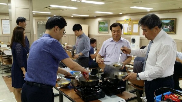 오세창 경기 동두천시장은 지난 6일 오전 8시 구내식당을 방문해 직원들을 격려하고 함께 아침식사를 하며 소통의 시간을 가졌다. 사진은 오 시장(맨 오른쪽)이 셀프 코너에서 국을 뜨며 직원들과 이야기를 나누는 모습.(사진제공=동두천시청)