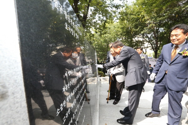 지난 8일 금천구문화체육센터 내 금천구 참전기념비 공원에서 국가보훈처 남부보훈지청 주관으로 ‘금천구 참전유공자 호국영웅 명비 제막식’이 개최됐다. 사진은 차성수 구청장 및 참전유공자가 명비에 새겨진 이름을 확인하는 모습.(사진제공=금천구청)