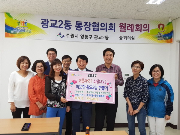 경기 수원시 광교2동 통장협의회 19명은 지난 7일 어려운 이웃 등 소외계층을 위해 소중히 써달라며 추석맞이 이웃돕기 성금을 동주민센터에 전달했다. 사진은 관계자들이 기념촬영을 하는 모습.(사진제공=영통구청)