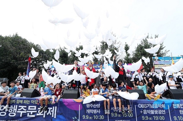 9일 오전 행주산성 일대에서 열린 개막행사에 참석한 단체 및 시민들이 평화 비둘기 풍선을 날리며 축제의 시작을 함께 축하하고 있다.