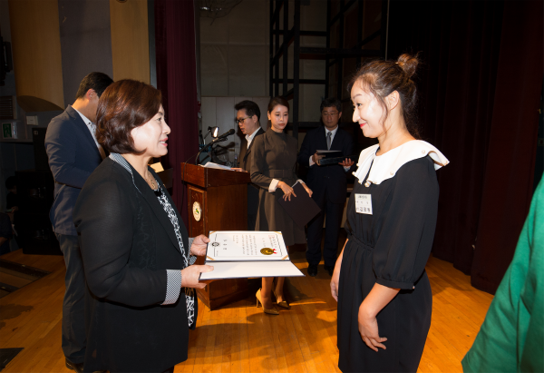 서울 은평구의회가 최근 은평문화예술회관 대공연장에서 열린 ‘2017년 보육인의 날’ 기념행사에 참석해 지역내 보육사업을 위해 헌신·봉사해 온 보육사업 유공자 12명에게 은평구의회 의장 표창을 수여했다. 사진은 이연옥 위원장(왼쪽)이 표창장을 수여하고 있는 모습.(사진제공=은평구의회)