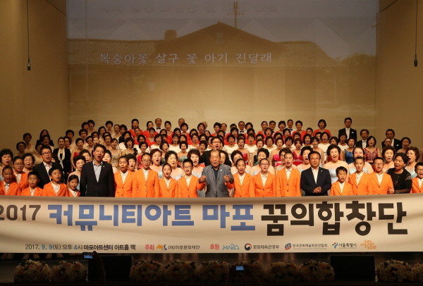지난 9일 박홍섭 마포구청장(가운데)이 (재)마포문화재단 주최로 마포아트센터 아트홀맥에서 열린 커뮤니티 예술축제 '꿈의 무대'에 참석해 이봉수 구의원, 차재홍 구의원 및 출연진들과 '고향의 봄'을 합창하고 있다.(사진제공=마포구청)