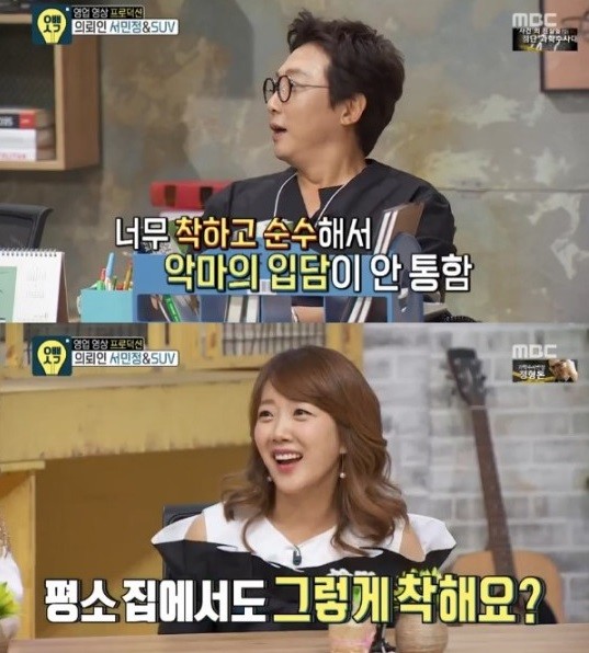 당시 방송에서 이상민은 서민정에 대해 "캐릭터가 너무 착하고 해피하고 너무 밝은 바이러스예요"라고 말했고, 탁재훈은 "평소 집에서도 그런 모습으로 계속 있으시냐"고 물었다.