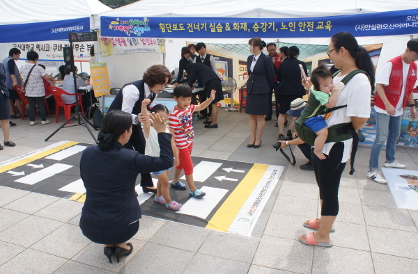 경기 (사)오산시자원봉사센터는 최근 오산스포츠센터 앞 광장에서 2000여명의 시민과 청소년이 참여한 가운데 ‘제8회 오산시자원봉사박람회’를 개최했다. 사진은 행사에 참가한 아이들이 ‘횡단보도 건너기 실습’을 하고 있는 모습.(사진제공=오산시청)