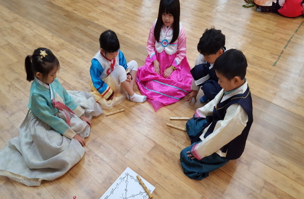 경기 부천시 석천초등학교에서는 이달 11~14일 'Small School' 교육의 일환으로 1학년 예절교육 수업을 진행하고 있다. 사진은 한가위를 맞이해 지난 11일 학생들이 한복을 입고 윷놀이를 하는 모습.(사진제공=부천교육지원청)