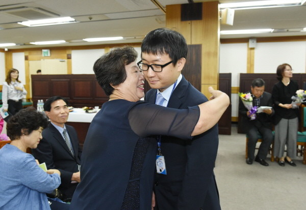 지난 11일 오전 중랑구청 4층 기획상황실에서 신규 공무원 23명과 가족, 동료직원 등 100여명이 참여한 가운데 '가족과 함께하는 신규공무원 임용장 수여식'이 열렸다. 사진은 행사에 참석한 부모가 신규 공무원을 안아주는 모습.(사진제공=중랑구청)