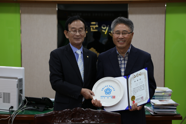 | ▲ '자랑스러운 칭찬주인공'으로 선정된 이동진 무안군의장(오른쪽)이 '칭찬합시다 운동중앙회' 관계자로부터 상패와 표창장을 받았다. | ||