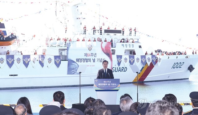 문재인 대통령이 13일 오전 인천 중구 인천해양경찰서 전용부두에서 열린 '제64주년 해양경찰의 날 기념식'에 참석해 축사하고 있다.