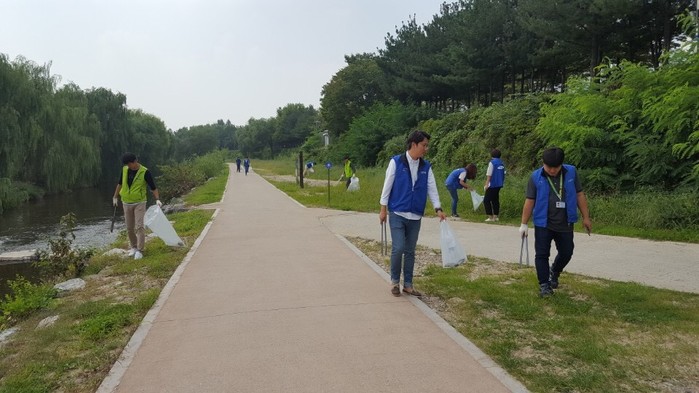 경기 수원시 영통구에서는 최근 지역주민, 매탄·원천동 및 구청 직원과 삼성전자 직원 등 60여명이 참여한 가운데 원천리천 대청소를 실시했다. 사진은 참여자들이 쓰레기를 수거하는 모습.(사진제공=영통구청)